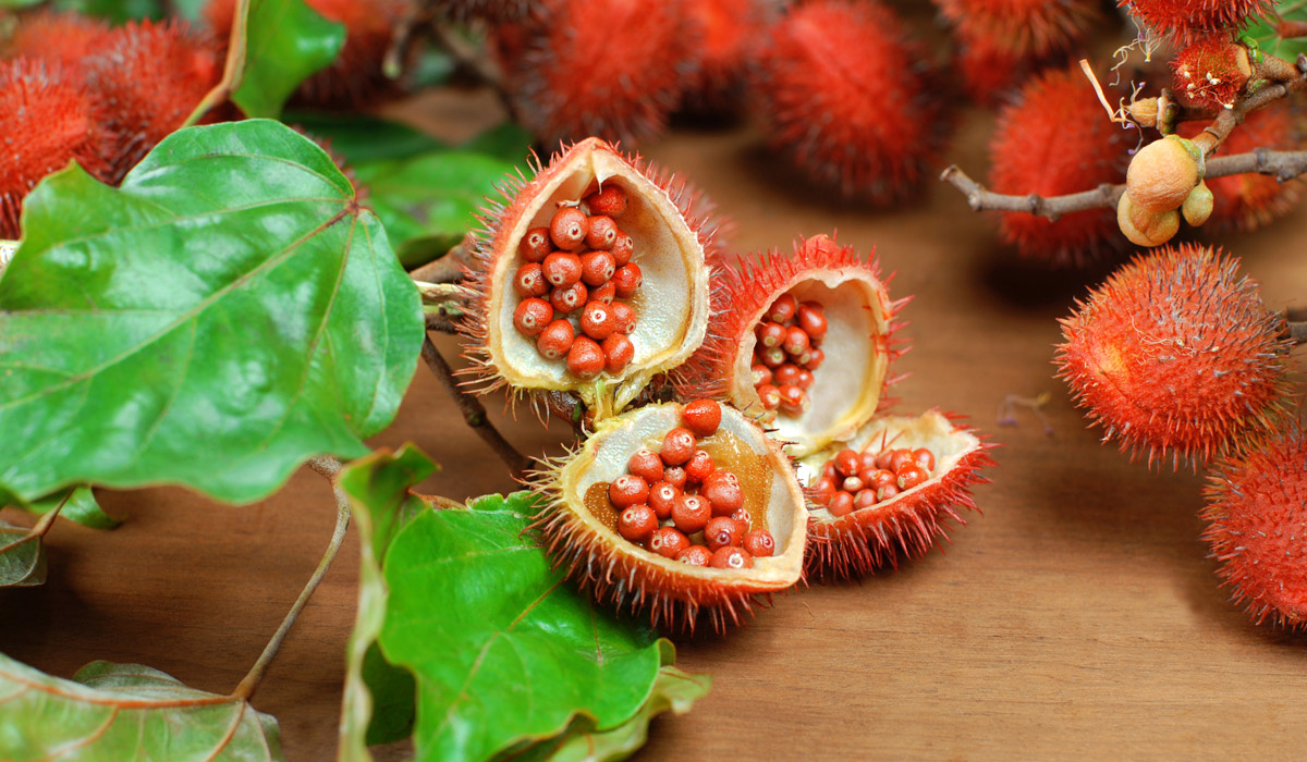 ROUCOU : Ses graines sont riches en bêta-carotène, elles stimulent la mélanine et donne à la peau un éclat naturel et uniforme. Le Roucou a des bienfaits apaisants et réparateurs.