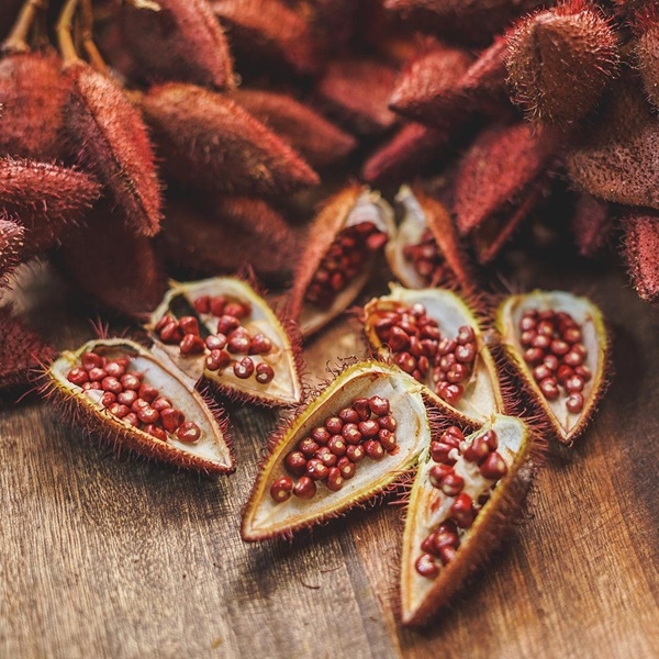 ROUCOU : Ses graines sont riches en bêta-carotène, elles stimulent la mélanine et donne à la peau un éclat naturel et uniforme. Le Roucou a des bienfaits apaisants et réparateurs.